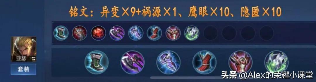 蓝色铭文隐匿或长生辅助铭文:宿命或圣人这套铭文搭配着重提升亚瑟的物理攻击和穿透能力,同时兼顾生存和冷却缩减,隐匿铭文增加移动速度和攻击力,鹰眼提升物理穿透,异变进一步增强物理攻击,长生和隐匿的蓝色铭文可根据个人喜好选择,前者增加生命值,后者增加移动速度,辅助铭文则可选择宿命或圣人,以增加防御属性和法术攻击。